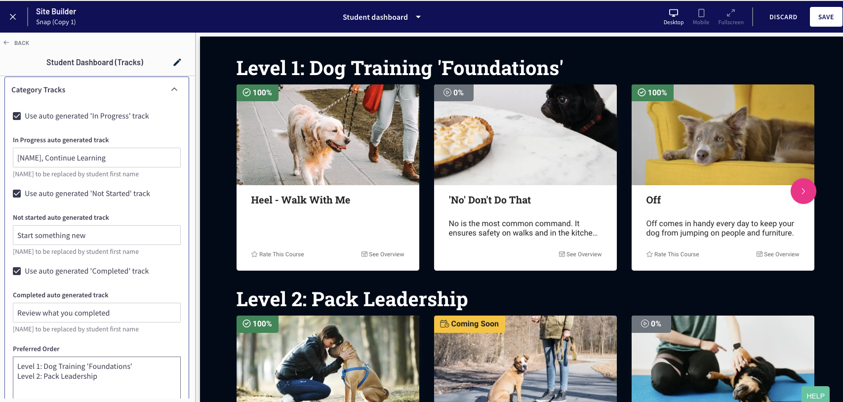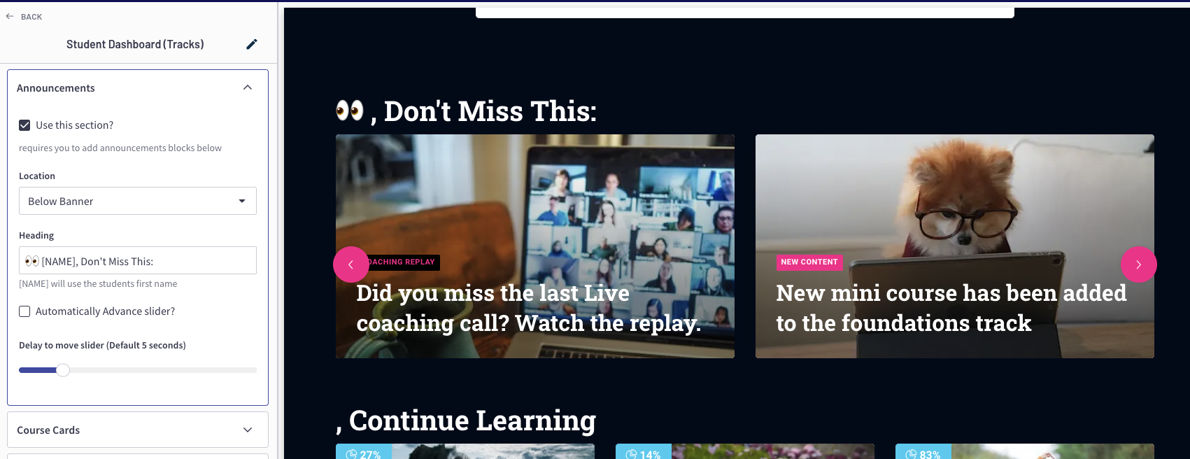 This superpower will auto-arrange your students courses into category tracks and progress based tracks. You can also used the built-in announcements track to show off your latest content.