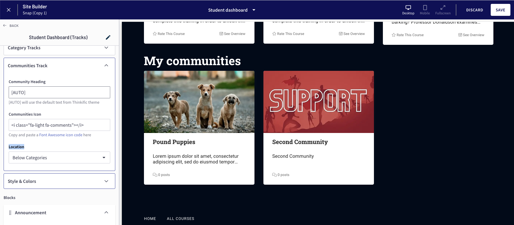 * Community Heading - This will set the text for the heading of the communities track. \[AUTO] will use the default text from Thinkific theme