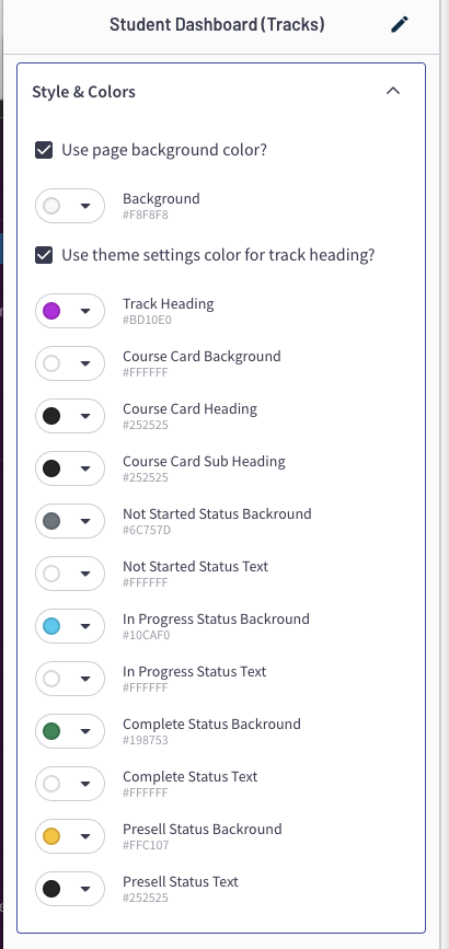 We always try to have the style of our page templates blend in instantly with whatever Theme style and color scheme you are using. Each color option indicates where the default color is coming from  the [Thinkific Theme Settings](https://support.thinkific.com/hc/en-us/articles/360033673933). You can also over-ride these settings and select a color combination that works for you.