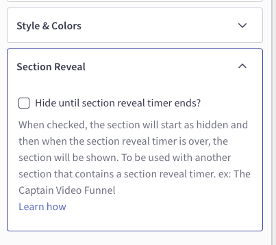 In each of the Build Your Own sections there is a settings group for Section Reveal settings. When checked, the section will start as hidden and then when the section reveal timer is over, the section will be shown. To be used with another section that contains a section reveal timer. ex: The Captain Video Funnel. This allows you to create a "hidden" sales page or special offer that will be revealed at just the right time.
